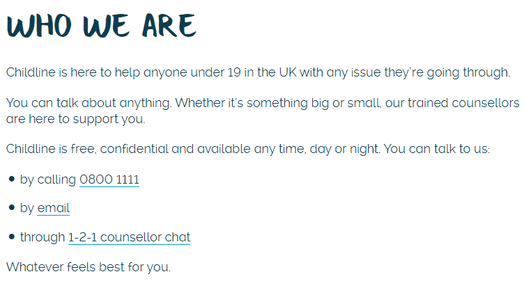 The following information is taken from the Childline website (the link is below).